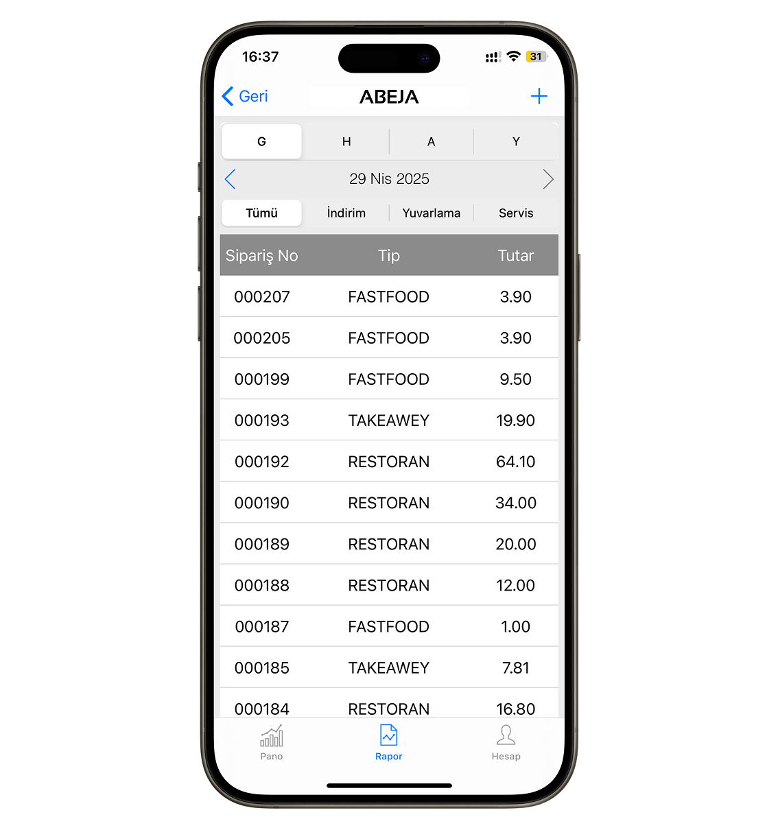 Verilen filtreye göre işletmenizde ki tüm siparişleri liste şeklinde görebilir , siparişleriniz de indirim , yuvarlama veya servis hizmeti varsa bunları tek tuş yardımı ile ayrı olarak filitreler ve inceleyebilirsiniz.